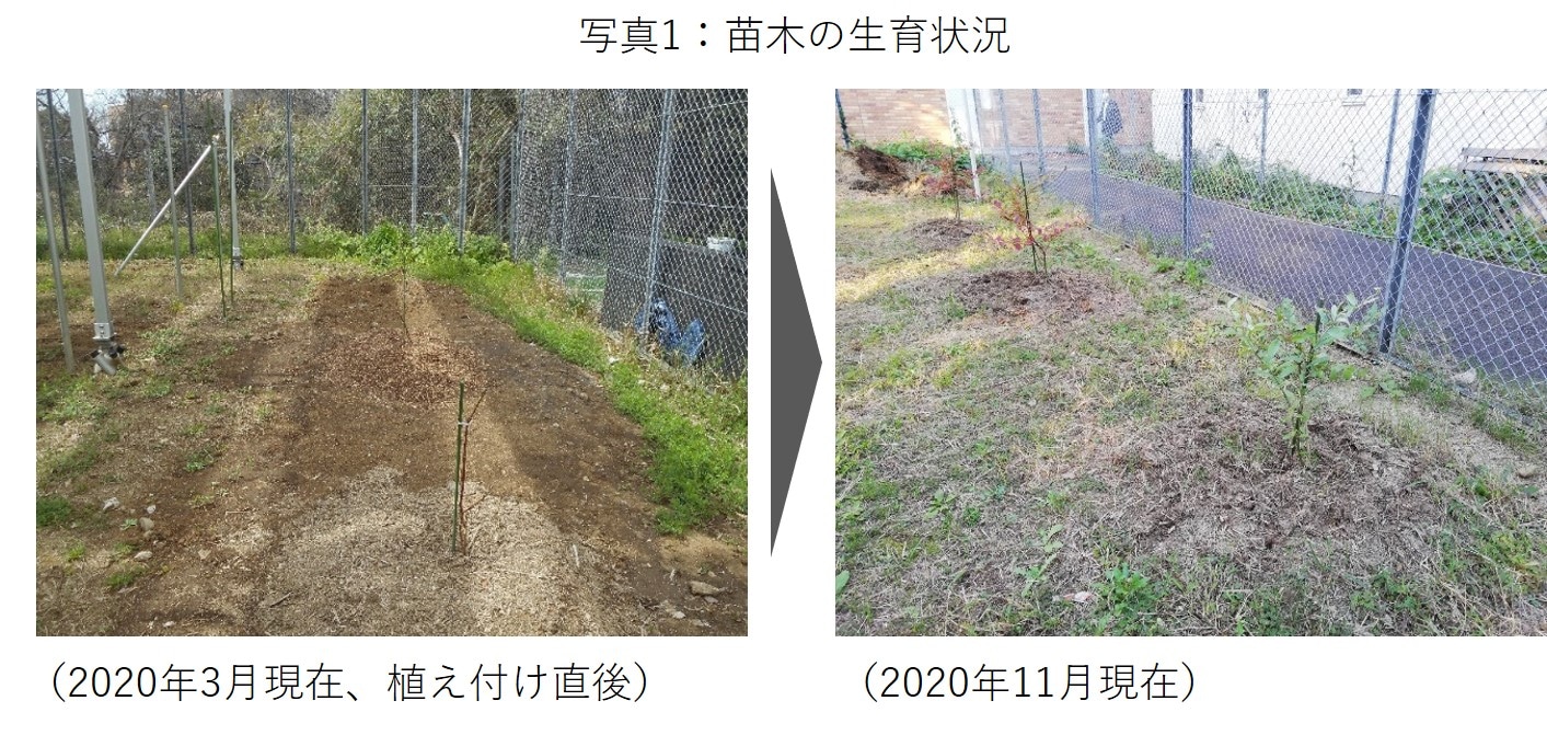 千葉商科大学の市川キャンパス内にも2020年2月中旬、エザワフルーツランドから贈った苗木5本を「ど根性栽培」方式で植えました。かつてピッチング練習場だったというキャンパス内圃場では、苗木を植えるために掘った穴から20cm大の石がゴロゴロと出てきて、決して豊かな土壌ではなかったですし、その後新型コロナウイルス感染性の拡大によりキャンパス入構および圃場の手入れができなかった期間もあり、苗木にとっては厳しい環境でしたが、写真1の通りしっかりと根を張り、枝数も増えていきました。農薬も化成肥料も、そして水やりもしなくても、苗木は水を求めて圃場の土にしっかり根を張り、まさに「ど根性」で育ったことが分かるわけです。